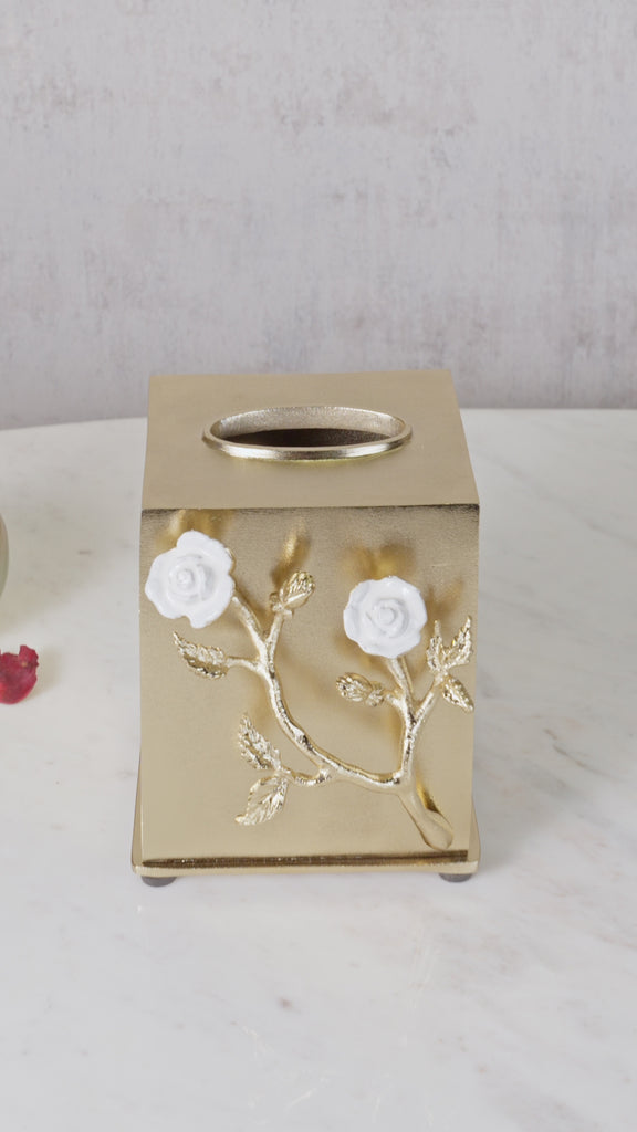 Elegance and beauty all wrapped up into one rosy gold tissue box, this is perfect for your bathroom or even your dressing room. The gold finished aluminum box is adorned with the most delicate off white enamelled aluminum roses. Delicate beauty like no other, this item elevates any home.