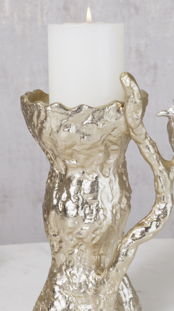Candle holders are the perfect way to add light & drama to any space. The flycatcher bird pillar candle holder is an ode to nature's beauty, handcrafted with gold finished & nickel plated aluminum, these candle holders bring a cheerful feeling to your home.