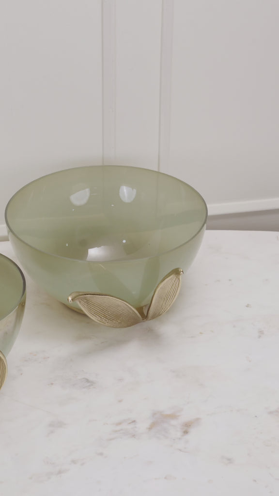 The enclosed leaf bowl is adorned with ombre jade colored glass, transitioning from a deep, lush green to a soft, translucent hue. This gradient effect enhances the bowl's visual appeal, creating a serene ambience that captivates the eye and enriches any space.