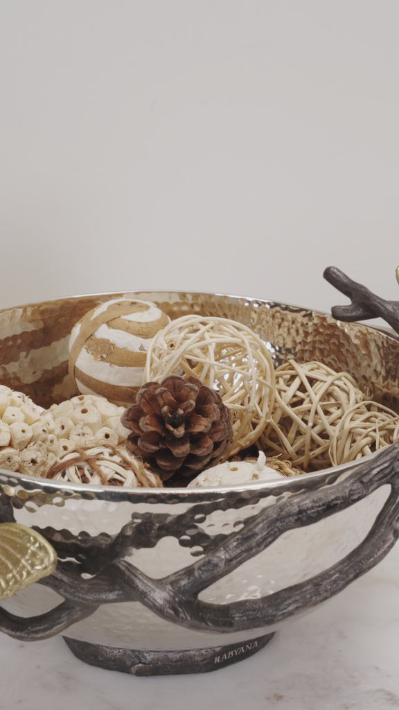The metal petal bowl is a striking blend of nature’s beauty and refined craftsmanship. Made with a combination of gold finished  butterfly accents, rustic black branches, and hammered nickel aluminum, this bowl evokes the enchanting charm of a forest grove. The delicate butterflies bring a touch of lightness and elegance, while the textured black branches provide a grounding, earthy contrast. The hammered nickel aluminum adds a subtle sheen and sophisticated texture, making this piece an exceptional statement for any space.