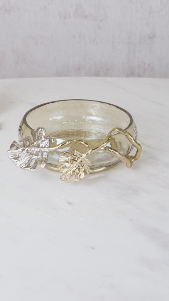 Carefully handcrafted of gold finished and nickel plated aluminium with textured smoke luster glass, the monstera leaf bowl brings a whiff of the easy breezy island vibe to your home. Use these lush decorative bowls in different sizes & shapes to elevate your home's design scheme.