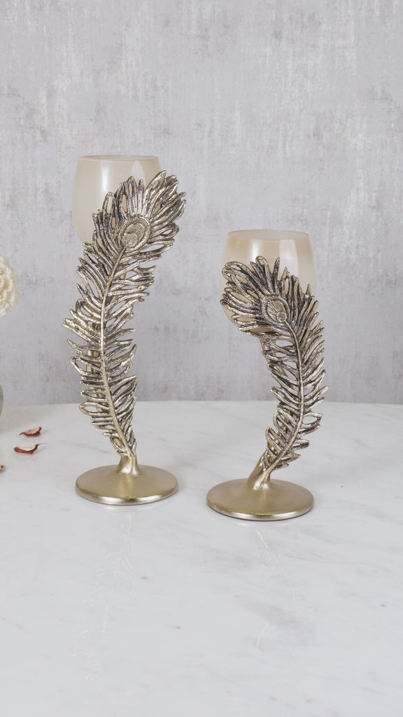 Bring a touch of nature-inspired elegance to your space with the feather flame candle holder. Crafted from gold and antique gold-finished aluminum, its design mimics the delicate form of feather fronds, gracefully supporting an ombre light beige glass cup. The gentle gradient of the glass creates a warm, ambient glow when lit, adding an enchanting charm to any room.