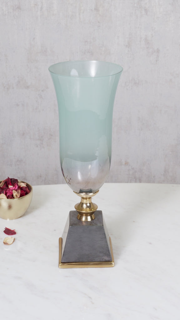 The ombre teal-colored glass holder adds a touch of serenity, casting a gentle glow that enhances the rich metallic hues. Perfect as a statement piece, the candle holder balances rugged beauty with graceful charm, making it an eye-catching addition to any space.