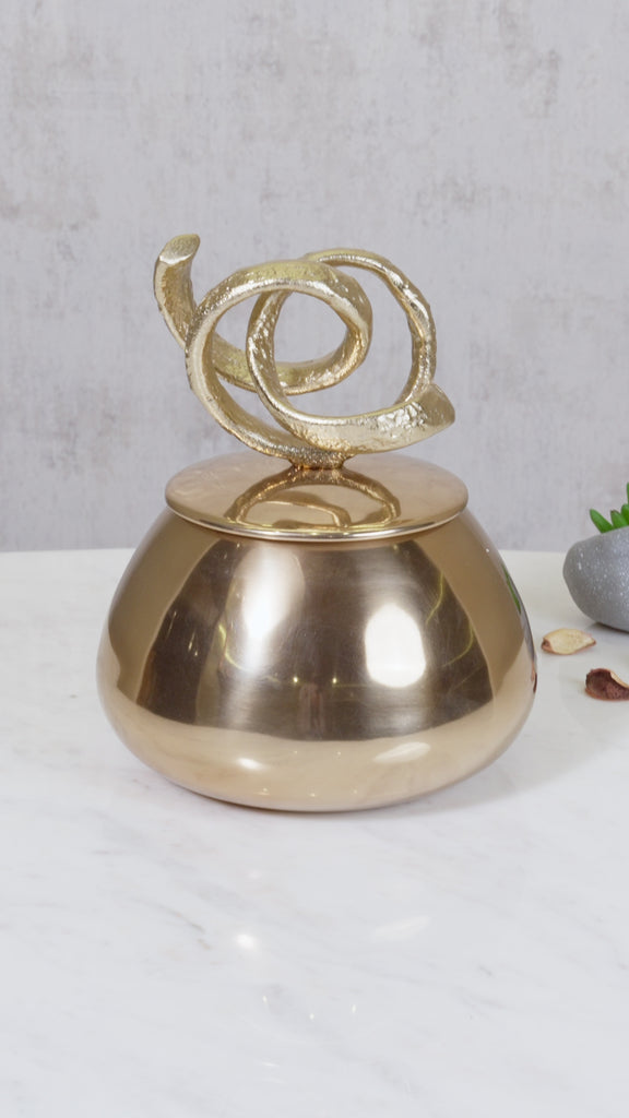 The enchanted harmony Jar is a stunning blend of texture and shine, crafted from textured gold and polished deep gold-finished aluminum. This elegant jar features a captivating design, complete with a lid adorned with two graceful twirls, adding a touch of whimsy to its sophisticated allure. Ideal for storing treasured items or as a decorative accent, this enchanting jar effortlessly enhances any space, making it a perfect choice for those who appreciate timeless beauty and artisanal craftsmanship.