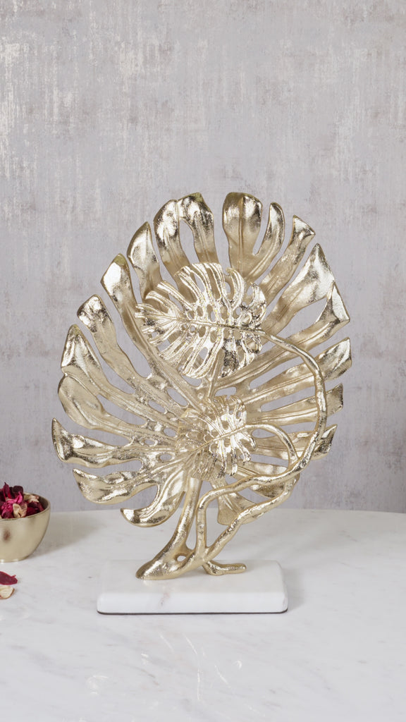 The monstera leaf sculpture is bound to usher- in lush tropical island vibes into your home. Adorn this marvellous work of art in any formal area for a regale yet contemporary whiff of the tropicals. Forged in a radiant gold finish on aluminium with marble base.