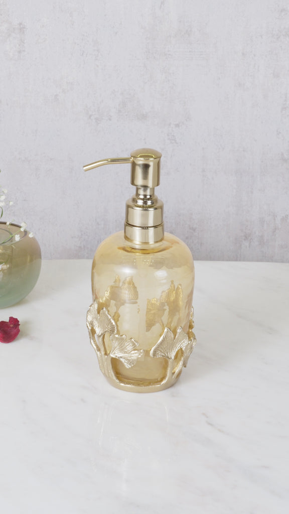 The gingko leaf soap dispenser add a magical, yet nature inspired design to your bathroom. Crafted for those with a keen eye for elegance, the piece is inspired by the natural beauty of the gingko leaf. The large leaves are carefully crafted out of gold finished aluminum to give it a majestic feel and the glass holder itself is made from a stunning gold lustre glass. This soap dispenser is a classy and grand addition to your bathroom decor.