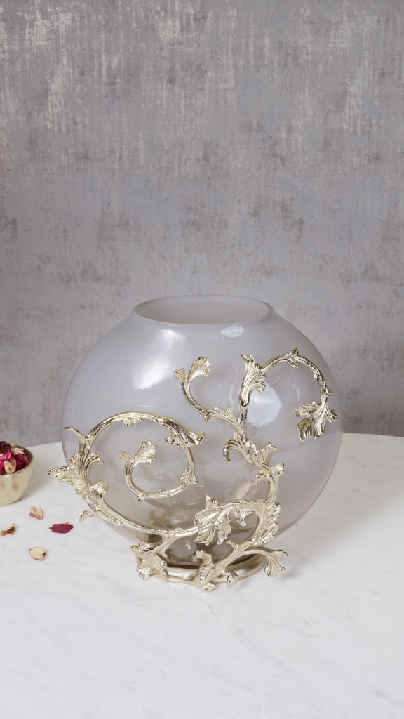 The grandeur vase is a captivating blend of nature and luxury, designed to elevate any space with its unique and sophisticated style. Made from gold-finished virgin aluminum, the vase features a stunning ombre grey colored glass that creates a striking visual contrast. The metallic fronds gracefully wrap around the vase, adding a touch of organic elegance and depth to the design.