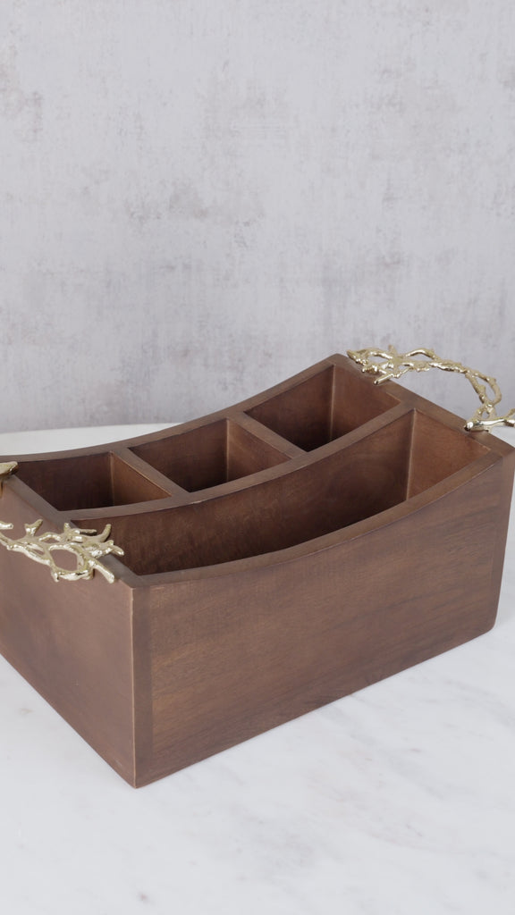 Inspired by the lush colonies of coral reefs under the ocean, this cutlery caddy brings a fresh and stylish touch to your table decor. Crafted beautifully from gold finished brass and walnut finished wood, the coral cutlery caddy is sure to make waves at your next dinner party.