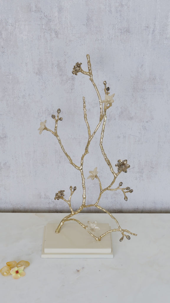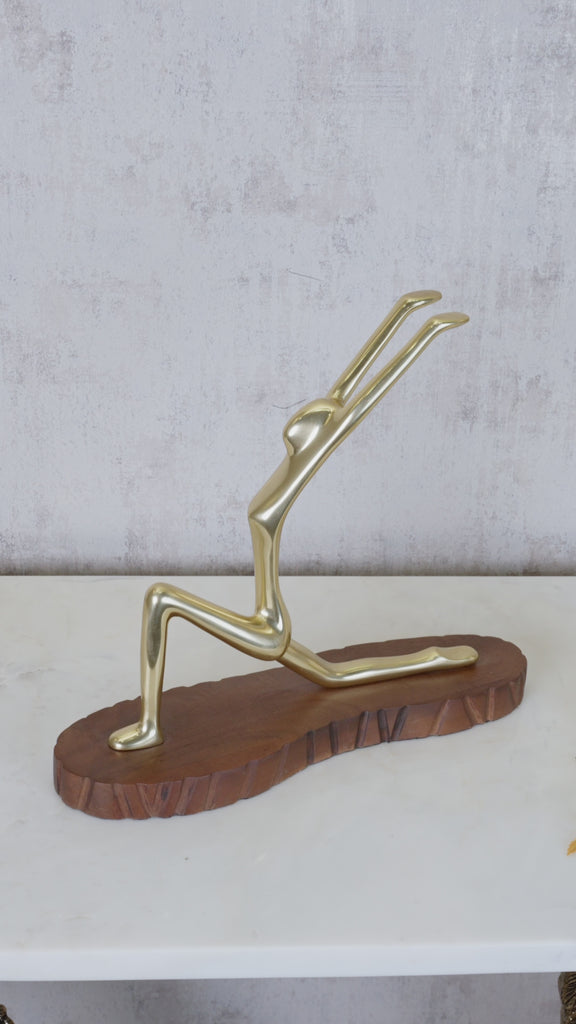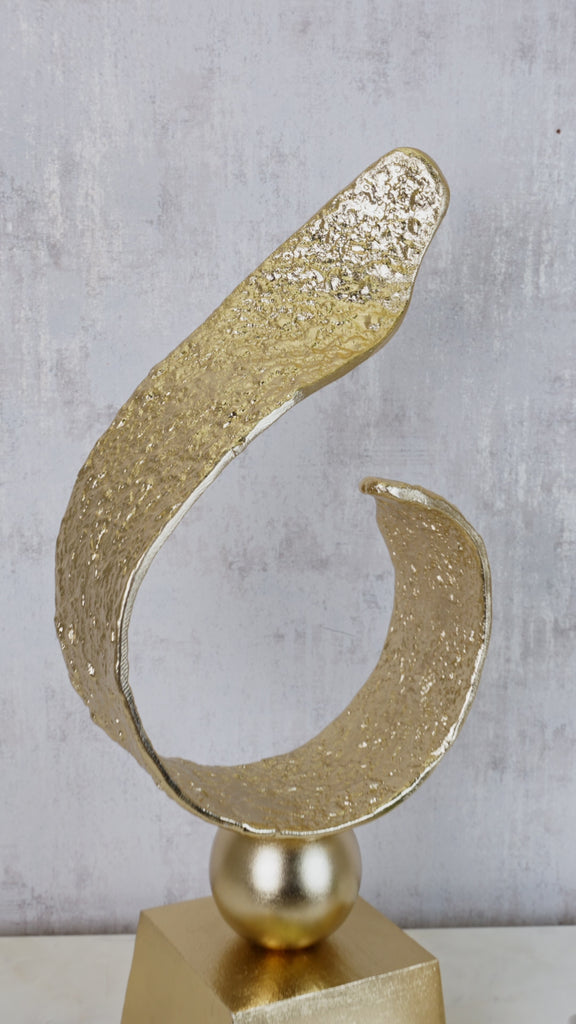 A contemporary decorative sculpture crafted from aluminum with a textured gold finish, showcasing bold geometric or abstract forms. Its tactile surface and radiant metallic sheen create captivating visual interest and evoke a sense of luxury. Perfect for consoles, shelves or tabletops, this piece seamlessly blends modern artistic sophistication with a warm, opulent finish, elevating any interior with contemporary elegance.