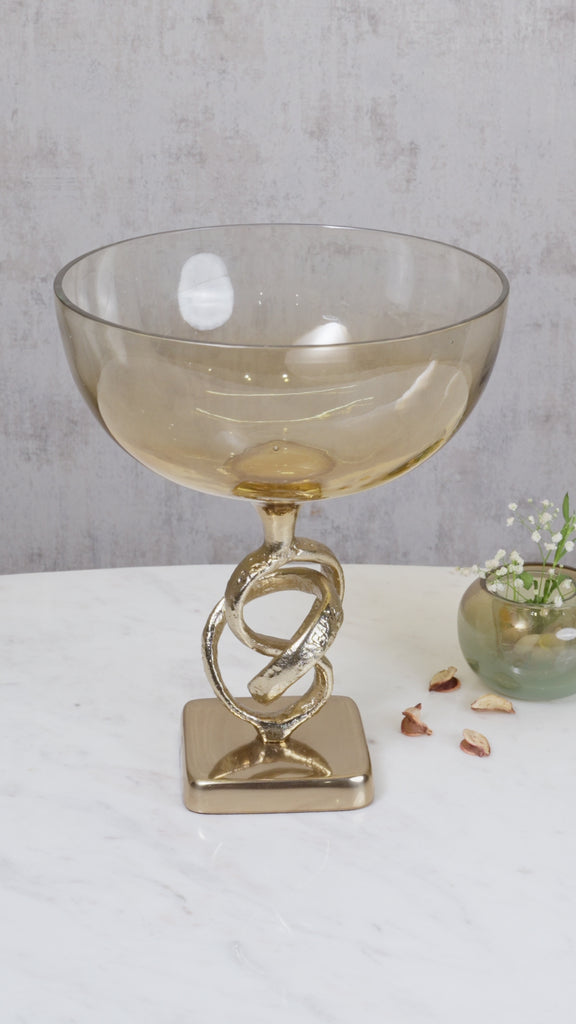 The enchanted harmony footed bowl features a striking design with textured gold and polished deep gold finished aluminum, beautifully paired with half brown luster glass bowl. The base showcases intricate twirl patterns that elegantly support the glass, creating a sophisticated and timeless piece for your décor.